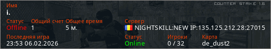 Последний раз был в сети 23:53 06.02.2026 Игрок с таким ником замечен на 5 серверах