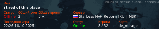Играет на Counter Strike Global Offensive сервере. Страна: РоссияПервый раз замечен 22:14 16.10.2025