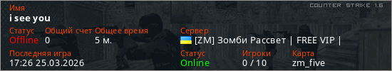 Играет на Counter Strike 1.6 сервере. Страна: УкраинаПервый раз замечен 17:24 25.03.2026