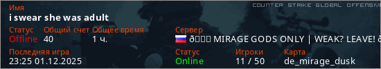 Играет на Counter Strike Global Offensive сервере. Страна: РоссияПервый раз замечен 01:59 21.11.2025