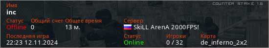 Играет на Counter Strike 1.6 сервере. Страна: РоссияПервый раз замечен 20:57 13.01.2024