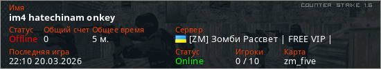 Играет на Counter Strike 1.6 сервере. Страна: УкраинаПервый раз замечен 22:02 20.03.2026