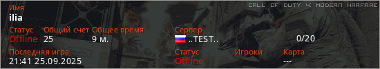 Играет на Call of Duty 4: Modern Warfare сервере. Страна: РоссияПервый раз замечен 20:59 23.09.2025
