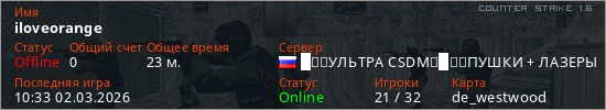 Играет на Counter Strike 1.6 сервере. Страна: РоссияПервый раз замечен 21:06 18.02.2026