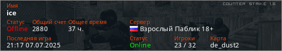 Играет на Counter Strike 1.6 сервере. Страна: РоссияПервый раз замечен 11:37 22.11.2022