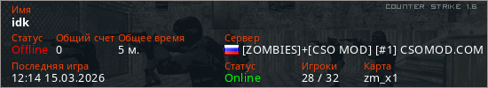 Играет на Counter Strike 1.6 сервере. Страна: РоссияПервый раз замечен 12:12 15.03.2026