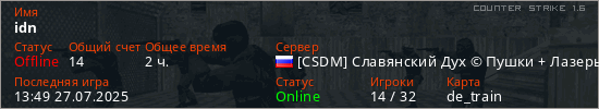 Играет на Counter Strike 1.6 сервере. Страна: РоссияПервый раз замечен 15:54 09.07.2025