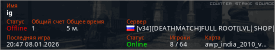 Играет на Counter Strike Source сервере. Страна: РоссияПервый раз замечен 20:43 08.01.2026