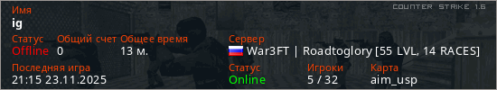 Играет на Counter Strike 1.6 сервере. Страна: РоссияПервый раз замечен 14:46 05.02.2023