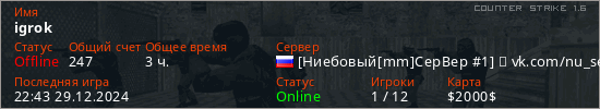 Последний раз был в сети 22:43 29.12.2024 Игрок с таким ником замечен на 28 серверах