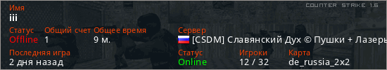 Играет на Counter Strike 1.6 сервере. Страна: РоссияПервый раз замечен 17:13 17.02.2026