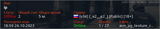 Играет на Counter Strike Source сервере. Страна: РоссияПервый раз замечен 18:52 26.10.2023