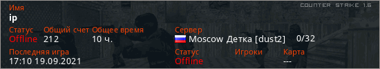 Играет на Counter Strike 1.6 сервере. Страна: РоссияПервый раз замечен 18:46 09.09.2021