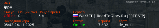 Играет на Counter Strike 1.6 сервере. Страна: РоссияПервый раз замечен 08:36 24.11.2025