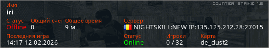 Последний раз был в сети 14:17 12.02.2026 Игрок с таким ником замечен на 10 серверах
