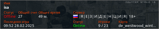Играет на Counter Strike 1.6 сервере. Страна: РоссияПервый раз замечен 12:06 18.03.2023