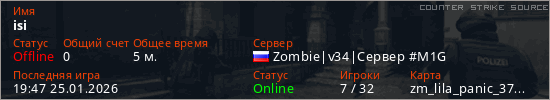 Играет на Counter Strike Source сервере. Страна: РоссияПервый раз замечен 19:45 25.01.2026