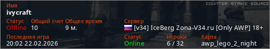 Играет на Counter Strike Source сервере. Страна: РоссияПервый раз замечен 19:25 22.02.2026