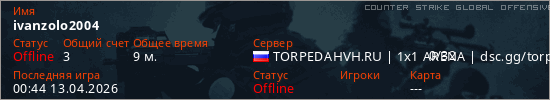 Играет на Counter Strike Global Offensive сервере. Страна: РоссияПервый раз замечен 18:46 09.04.2026