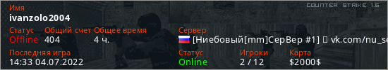 Играет на Counter Strike 1.6 сервере. Страна: РоссияПервый раз замечен 11:57 11.12.2021