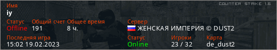 Играет на Counter Strike 1.6 сервере. Страна: РоссияПервый раз замечен 10:33 12.02.2023