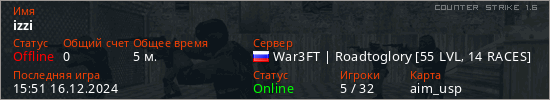 Играет на Counter Strike 1.6 сервере. Страна: РоссияПервый раз замечен 15:43 16.12.2024