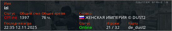 Последний раз был в сети 22:35 12.11.2025 Игрок с таким ником замечен на 31 сервере