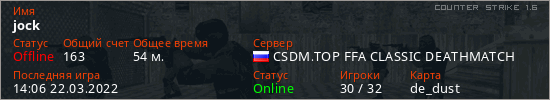 Играет на Counter Strike 1.6 сервере. Страна: РоссияПервый раз замечен 12:27 15.02.2022