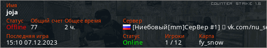 Играет на Counter Strike 1.6 сервере. Страна: РоссияПервый раз замечен 20:38 25.10.2023