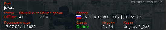 Играет на Counter Strike 1.6 сервере. Страна: РоссияПервый раз замечен 02:07 16.10.2025