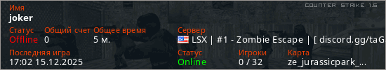 Играет на Counter Strike 1.6 сервере. Страна: СШАПервый раз замечен 17:00 15.12.2025