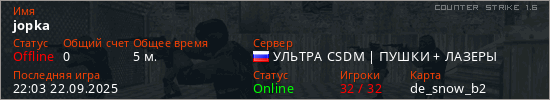 Играет на Counter Strike 1.6 сервере. Страна: РоссияПервый раз замечен 21:54 22.09.2025
