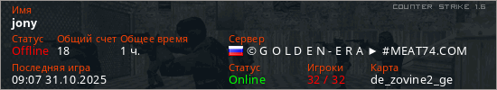 Играет на Counter Strike 1.6 сервере. Страна: РоссияПервый раз замечен 16:23 16.11.2023