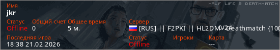 Играет на Half Life 2 DeathMatch сервере. Страна: РоссияПервый раз замечен 18:18 21.02.2026