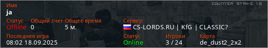 Играет на Counter Strike 1.6 сервере. Страна: РоссияПервый раз замечен 04:00 18.09.2025