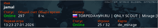 Играет на Counter Strike Global Offensive сервере. Страна: РоссияПервый раз замечен 13:23 27.01.2026