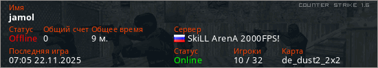 Играет на Counter Strike 1.6 сервере. Страна: РоссияПервый раз замечен 02:16 25.07.2023
