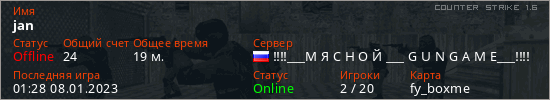 Играет на Counter Strike 1.6 сервере. Страна: РоссияПервый раз замечен 01:11 08.01.2023