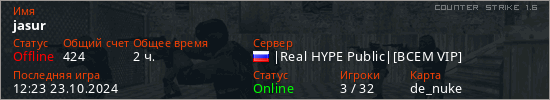 Играет на Counter Strike 1.6 сервере. Страна: РоссияПервый раз замечен 09:58 01.05.2024