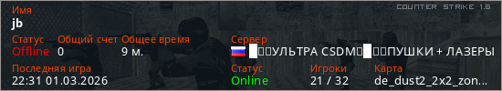 Играет на Counter Strike 1.6 сервере. Страна: РоссияПервый раз замечен 17:58 26.02.2026
