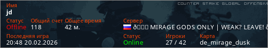 Играет на Counter Strike Global Offensive сервере. Страна: РоссияПервый раз замечен 06:56 20.02.2026