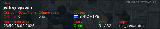 Играет на Counter Strike 1.6 сервере. Страна: РоссияПервый раз замечен 23:48 28.02.2026