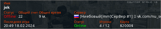 Играет на Counter Strike 1.6 сервере. Страна: РоссияПервый раз замечен 18:06 09.01.2024