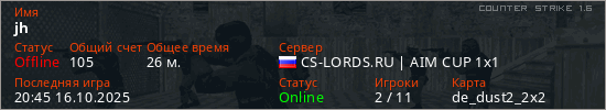 Играет на Counter Strike 1.6 сервере. Страна: РоссияПервый раз замечен 14:32 01.05.2025