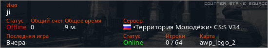 Играет на Counter Strike Source сервере. Страна: РоссияПервый раз замечен 15:05 12.12.2025