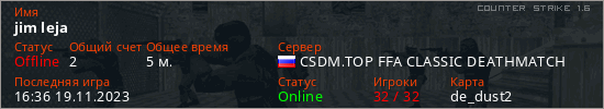 Играет на Counter Strike 1.6 сервере. Страна: РоссияПервый раз замечен 16:28 19.11.2023