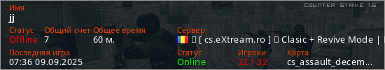 Играет на Counter Strike 1.6 сервере. Страна: РумынияПервый раз замечен 01:10 10.11.2024