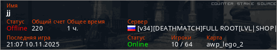 Играет на Counter Strike Source сервере. Страна: РоссияПервый раз замечен 01:05 06.02.2023