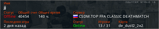 Играет на Counter Strike 1.6 сервере. Страна: РоссияПервый раз замечен 11:37 18.09.2021