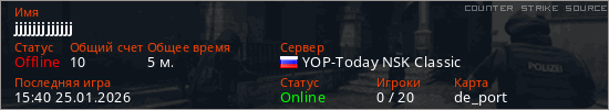 Играет на Counter Strike Source сервере. Страна: РоссияПервый раз замечен 15:38 25.01.2026